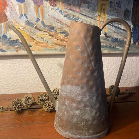 Kobbervandkanden er i hammerslået kobber med tud og håndtag af messing.
