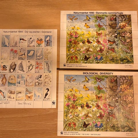 Danmark, WWF Naturmærker, 13 ark med Verdensnaturfonden WWF naturmærker.
