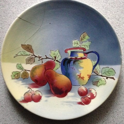 Platte, 1965, Sælger lille platte fra 1965 med blå blomst og guldkant. Porcelæns maling. Ingen ophæng på bagsiden. Rigtig sød.