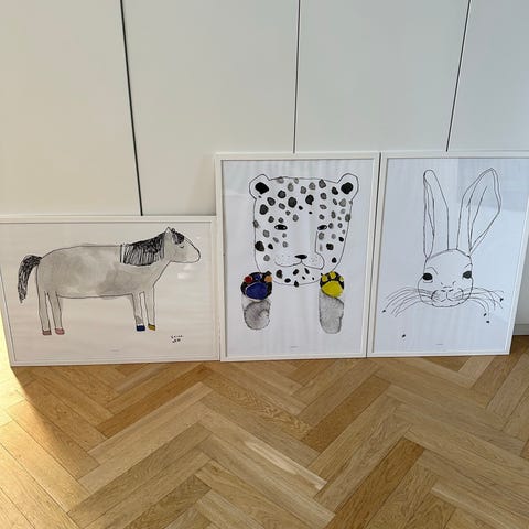 To skønne børneplakater med rim , Ukendt , motiv: Abe og krokodille, To skønne billeder i egetræsrammer af god kvalitet.