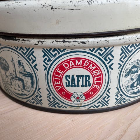 Gammel retro dåse kagedåse samleobjekter, FDB safir Veile dampmølle, Fed gammel charmerende retro dåse som på billede størrelse diameter ca 22cm højde ca 9cm. Sender MOD betaling af porto sendt med GLS som pakke UDEN omdeling 43kr.