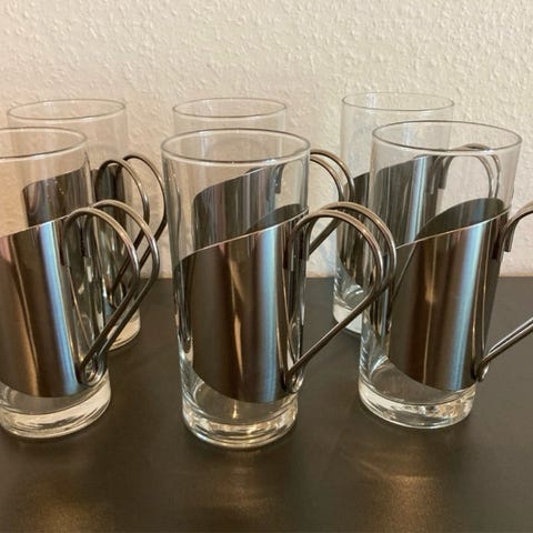 Borddækning. barudstyr. hjemmebar. aften hygge. Kaffedrik. caife Gaelach. kaffeglas. flydende dessert. 70erne. gamle Irish Coffee glas. Irish Coffee glas med måleenheder. Kaffe med whisky. glas til Irsk kaffe. Glas til varme drikke. Glas på fod til varme drikke. Retro glas