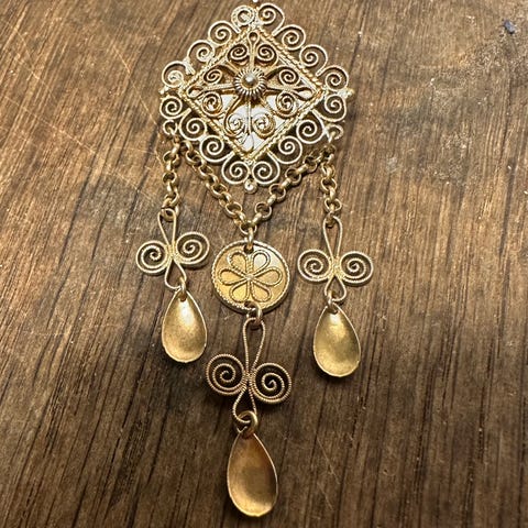 Broche, Norsk ( ? ) antik dragtsmykke i forgyldt sølv prydet m snoninger og andet symbolik. Dia 37 mm. Smukt og velholdt smykke, helt intakt og uden brugsspor. Stemplet 830S. Sender gerne ( + porto )