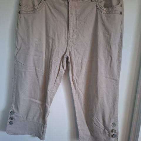 Længden er 3/4. Hvor mærket har siddet er der et lille hul (flosset hul). Sidder helt oppe ved bæltestrop og kun opdaget nu ved at jeg skulle tage nærbilleder.