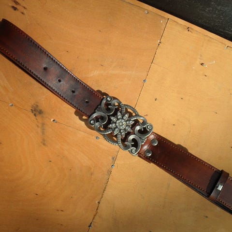 Bælte, FISK, str. 127 CM., BRUNT, God men brugt, FLOT BÆLTE MED NITTER OG METAL.