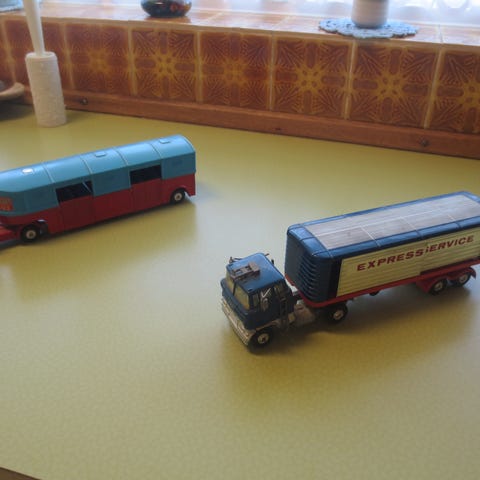 Modellastbil, Ford Ford, 1 stk Ford Trækker med Tiptrailer i Metal årg 1973 Kr 150 1 stk O&K MH 6 Gravemaskine i Metal Begge Fra Lesney Made In England Kr 150