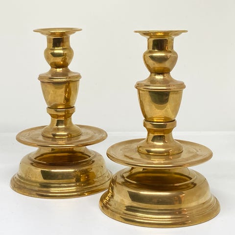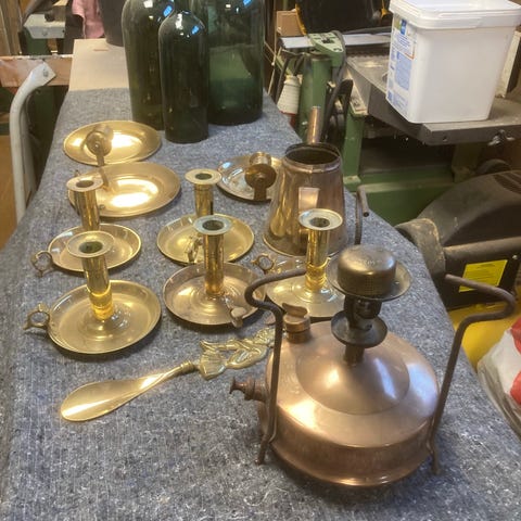 - Kop-fyrfadsstager i kobber med messinghank. Ø7,5cm. Højde: 3,5cm. 6stk.: 100kr.