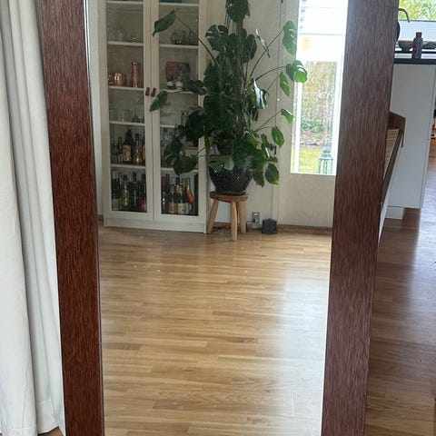 Vægspejl, b: 37 h: 45, Flot spejl i teakramme. To skruehuller til vægophængning og med en rammetykkelse på 2 cm.