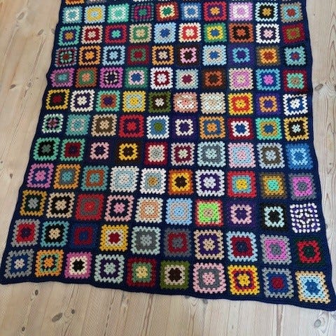 Stort smukt retro hæklet tæppe i fine farver. Hentes på Christianshavn. Sender ikke.