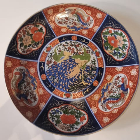 Porcelæn, Årstallerken, Okura Touen, Det japanske eksklusive porcelænproducent, Okura Touens årstallerken (1995). 19.5 cm i diameter. Japanske muslingmotiv og japansk kejsers tanka-digt ved års første tanke-digtlæsning i hof til nytår. Helt ny med æske og en lille plastik stativ, så tallerken kan stå.