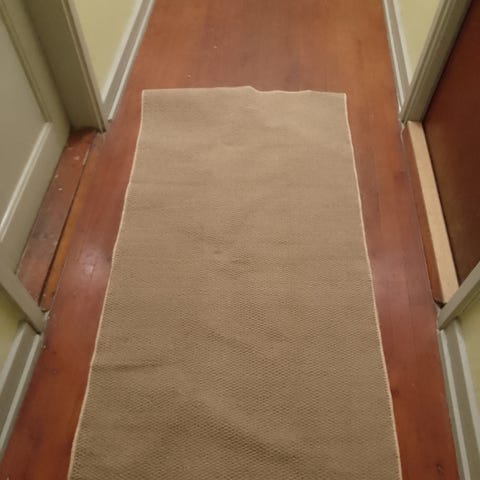 dobbeltlags jacquard-mønster og stadig brugbart og funktionelt. Det sælges meget billigt pga nogen slid. Har ligget udendørs på en overdækket altan i et par år. Men det har ingen huller eller skader. Det er er dog en smule beskidt af jord og nusset særligt i tæppets ene ende. Balsatre tæppet kan godt vaskes med vand og sæbe, og så bliver det som regel rimeligt pænt igen. Ellers kan det forkortes hvis man vil justere det.