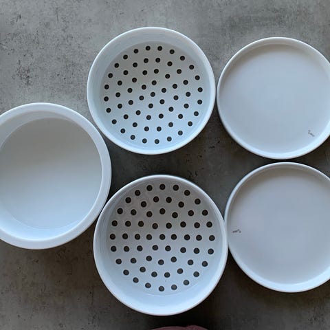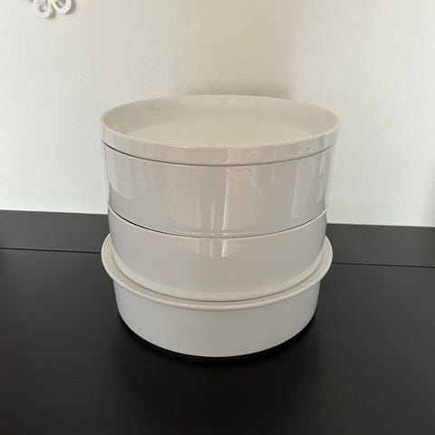 Damp maden i denne damper Steam Tower. Har tre lag. Lavet af hvid porcelæn. Kan også bruges i ovnen. Lågene kan også bruges som bordskånere....