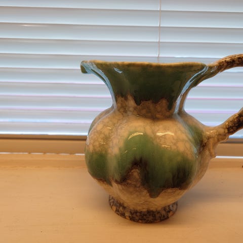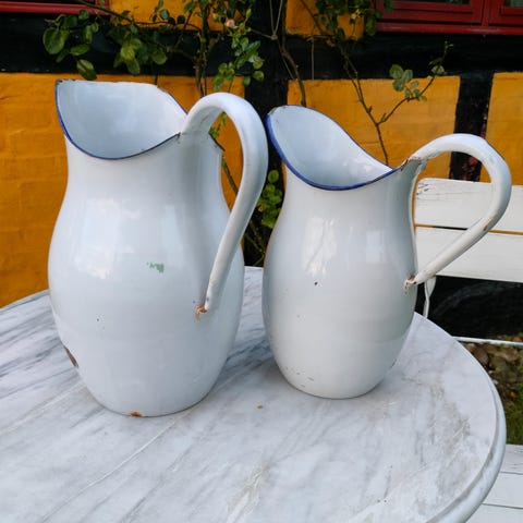 Fin gammel emalje kande, Lyseblå med sort hank. Højde 17,5 Ø 12. Fin til blomster eller vandkande. Afhentes.