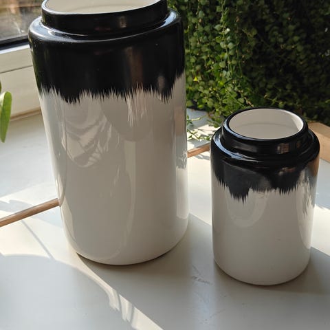 Krukker, Hvide porcelænskrukker med bambuslåg. Rigtig fine. Se billeder for mål.