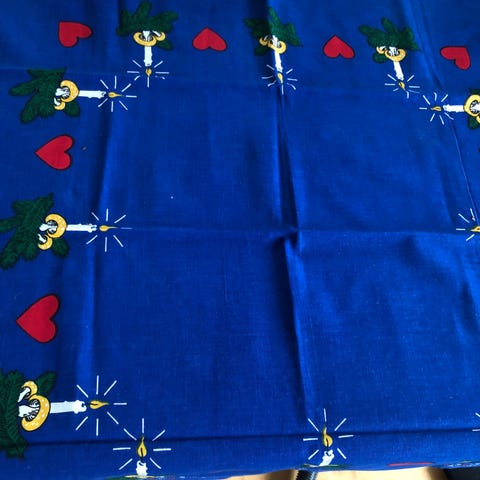 Juledug, Fin blå juledug med hjerter og klokker. 141 x 136 cm. Sender gerne men køber betaler selv for en eventuel forsendelse.