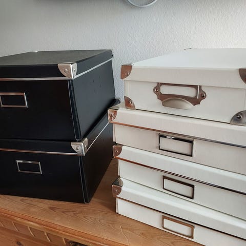 5 stk. arkivkasser, opbevaring, HELT NYE ! 5 stk. sorte arkivkasser med låg og greb, skillevæg til at tage ud, isat karton til at skrive på. Pris pr. stk. : 150,-kr.