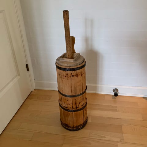 Smørkærne, træ og metal, 150 år gl., Smørkvern fra 1800-tallet, diameter 37cm. Antikvitet egnet til rekvisit teater/film.