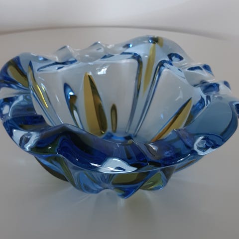 Glas, Skål, Murano, Murano glas skål. Orange, rød og med det yderste lag i lysblå. Måler ca 11,5x11,5 cm og er i fin stand uden skår