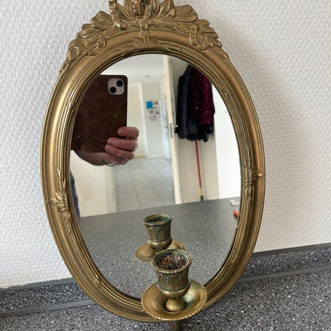 Vægspejl, b: 33 h: 49, FLOT VÆGSPEJL I MESSING MED FASETSLEBET GLAS.