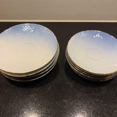 Porcelæn, Kagetallerkener og underkopper, Bing og Grøndahl, mågestel m/guld, 3 kagetallerkener og 4 underkopper fra det kendte stel fra Bing&Grøndahl. Mågestellet med guld blev designet i 1895 af Fanny Garde som arbejdede hos B&G.
