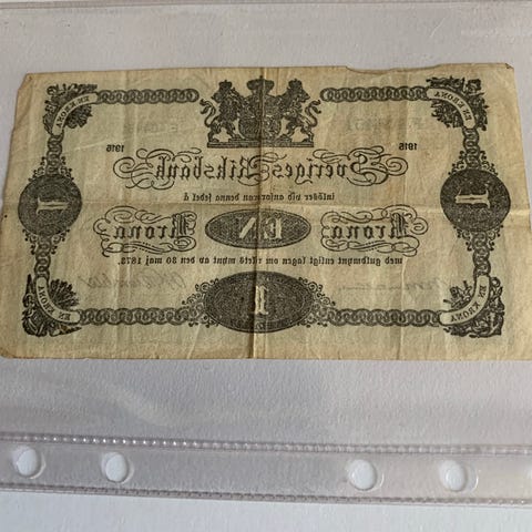 Skandinavien, sedler, 1 svenska krona, 1918, en gammel svensk krona en seddel fra den svenske rigsbank 1918 - en godt brugt seddel men lugter hverken af røg eller sur kælder