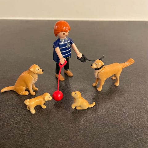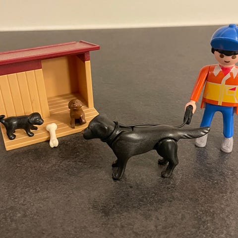 Playmobil, Hundetræner, 9279, Hundetræneren er i sit rette element. Det er ikke så mærkeligt, for hans lærenemme "elever" gør sig virkelig umage. Kun border collien gør af og til, som den har lyst til, men for en øvet træner er det ikke noget problem. Komplet med hundetræner, schæferhund, schæferhvalp, golden retriever og border collie. Nypris 99,-