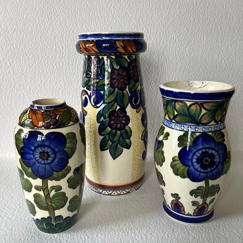 Vase med hanke, Aluminia , 100 år gl., Aluminia vase med 2 hanke, dekoreret med blomsterløv og blomster i grønne og orange og lilla farver på lys bund.