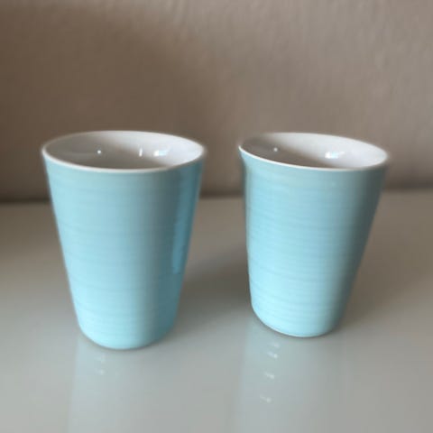 Porcelæn, 2 nye Hvide krus med hank, Aida Atelier, 9,6 cm høj, 7,7 cm i diameter foroven.