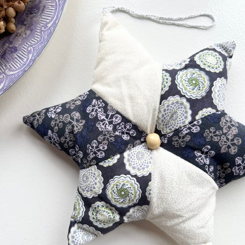 Jule patchwork julestjerne, Super fin med guldperler på alle spidser og snor til ophæng. Sender gerne men køber betaler selv for en eventuel forsendelse.