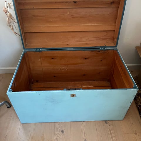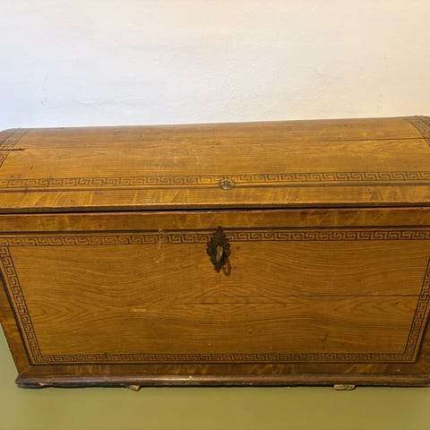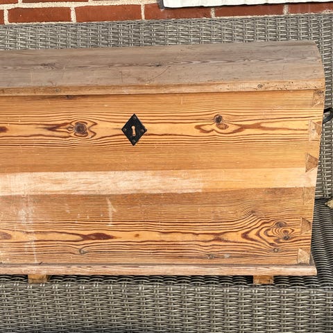 Skibskiste , 120 år gl., Fin antik skibskiste, fra dengang man fik arbejde, og skulle bo på jobbe og have sine personlige ting med. Den måler 40x78 og er 53 cm høj.