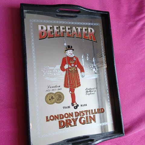 Metal bakke, Beefeater gin, Metalbakke fra 60er med reklame for Beefeater gin - meget få aldersrelaterede spor. Mål 35x35 cm