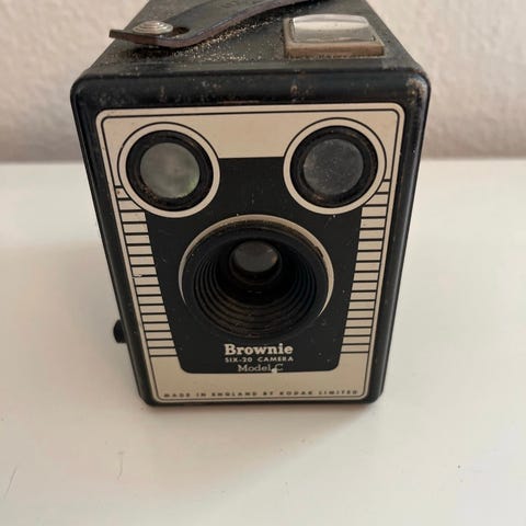 Kodak, Six-20 Brownie E, Perfekt, Vintage boxkamera fra berømte Kodak. Denne model er produceret i England lige før 2. Verdenskrig og er i klassisk Art Deco stil. Original lædertaske medfølger. Du kan se flere specifikationer her : Produced : 1939 - 1940