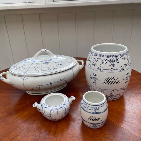 Fajance, stor terrine, willroy og bach, en stor terrine servings skål fra willory og bech 31 cm lang og 21 cm bred med låg i fin stand og meget ældre . der er lidt brugsspor i bunden og en enkelt fejl i dekoratinen ovenpå . foretrækkes afhentet her eller sendes for købers regning der så vil være 54 kr