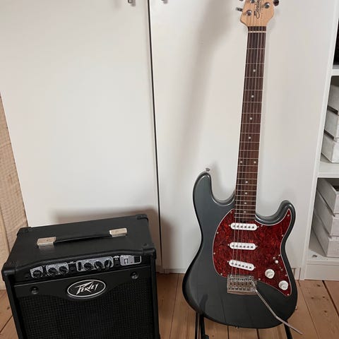Elguitar, andet mærke, Har en smuk el guitar som jeg desværre må give videre til en anden som vil få samme glæde. Jeg er ikke enakteret musiker så ved ikke meget om den udover den er perfekt til at spille god tråd! Tuner, mobilkasse og node book medfølger Kom med et bud