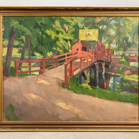 Oliemaleri, Wilkan, b: 68 h: 55, Gammel kvinde ved ladebygninger nær Lellinge Å. Behov for lettere rens. Maleriet signeret E Wilkan. Rammemål 80x67.