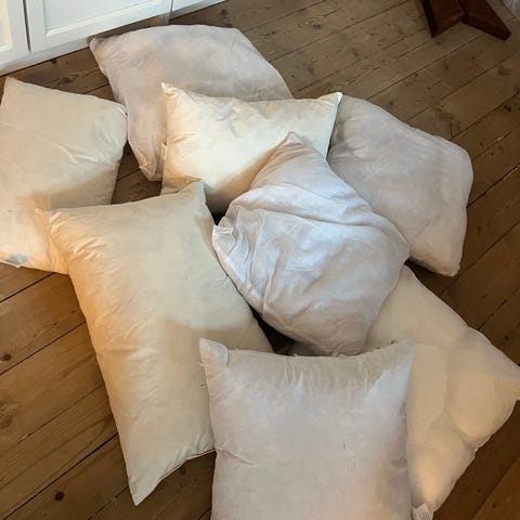 Monterings pude med fjerfyld, Mål: 20 x 60 cm. 2 stk med fjer fyld. Sælges helst sammen. Nypris 149 kr. Stk pris