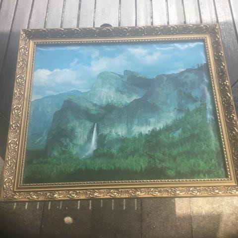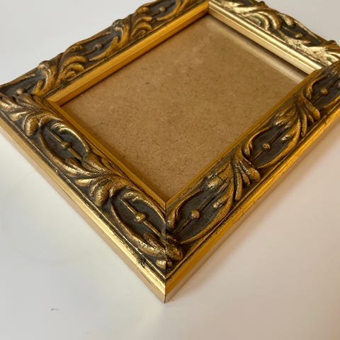 Guldfarvet træramme, Gammel, med patina, højde 86 x bredde 66 cm, tykkelse 5 cm, vægt 4,8 kg, indvendig højde 64 x bredde 44 cm, i nyere tid monteret med Marilyn Monroe plakat, og plexiglas, meget små afslag i 2 hjørner.