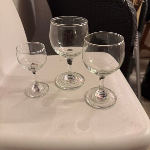 Glas på fod: 42 i alt, Dema 8 cl/ 2 dl / 3 dl, Brug til børnefødselsdagen ø, reception med pirtionssnretninger som fx sild, frokosten m/tilbehør, shots, morgenbordet til juice, popcorn, sluk, snack, blomster