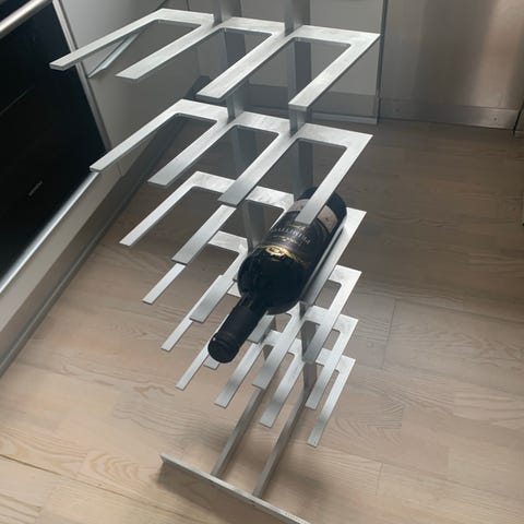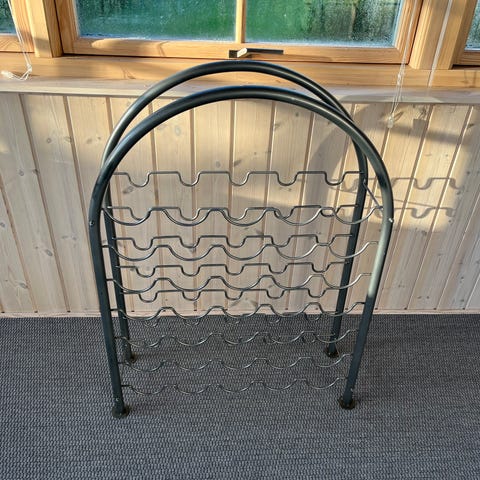 Billede 2: Sort gulv-vinreol til 48 flasker. Dybde: 20cm. Bredde: 65cm. Højde: 110cm. 200kr.