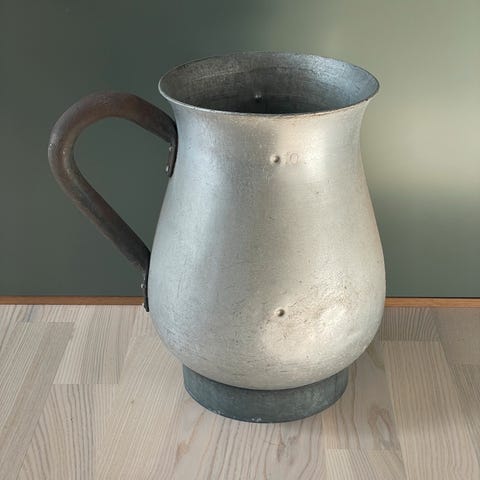 Vase / kande, Gammel kaffekande i måske tin med hank og låg i porcelæn.