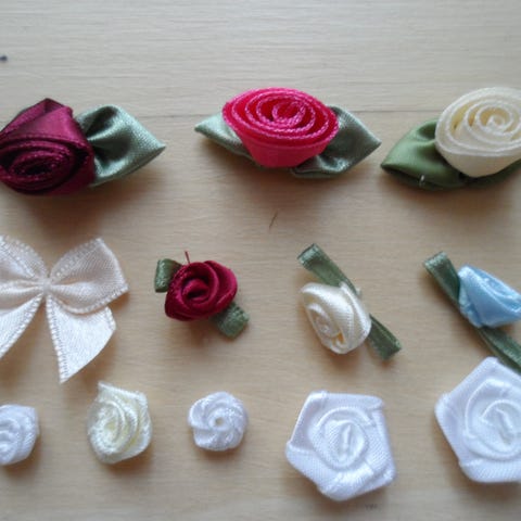 Andet, 77 blomster og 45 sløjfer, Blomster og sløjfer i stof, sælges samlet.