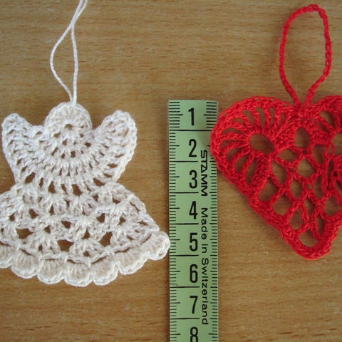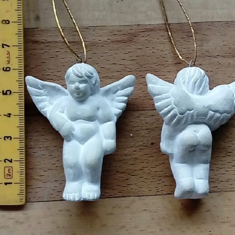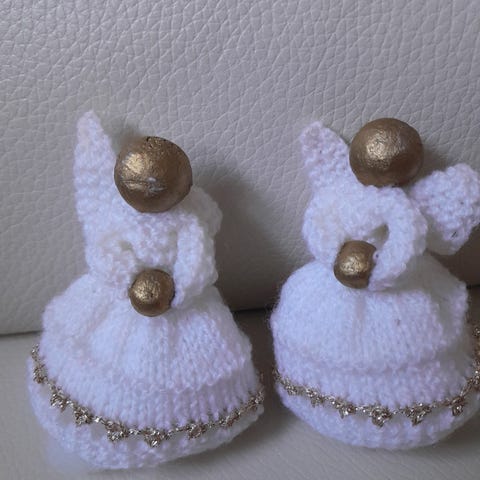 2 hæklede engle med snore, Super fint hæklet. Ca. 13 cm. høje og en bredde på ca. 10 cm. Sender gerne men køber betaler selv for en eventuel forsendelse.