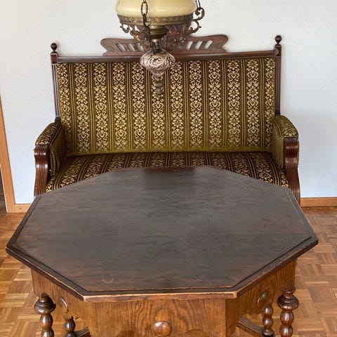 Sofa + sofabord , 125 år gl., b: 130 d: 70 h: 105, Sofa + sofabord sælges på grund af pladsmangel, sofaen er ombetrukken og bordet trænger til opslibning og ny behandling, men er i god stand - virkelig flot møbelsæt fra gammel tid