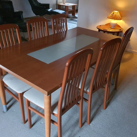 spisebord, bord, 1 STK spisebord har lidet skjold mærker L = 161cm / 206cm B = 102cm + 6 stole