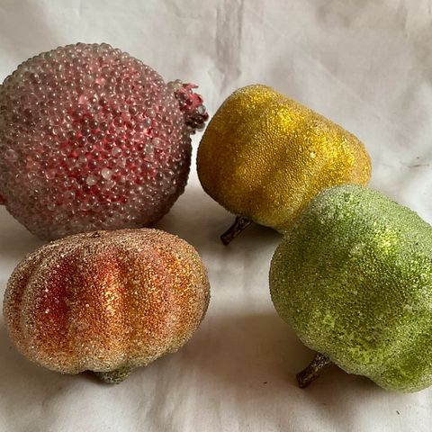 Frugter, Kunstige frugter og grøntsager, Begge dele holder evigt. Annanas 50 kr vi har 2 stk. Mandarinerne 5 kr stk. Blommer 5 kr stk. Frugten til venstre 2 stk samlet 10 kr. Appelsin og fersken 10 kr stk. Kirsebær 7 stk 50 kr. . Æbler på billede 2 koster samlet 25kr . Grønsager på billede 3 koster 10 kr stk. Rabat gives ved større køb. Dem med kryds over er solgt.