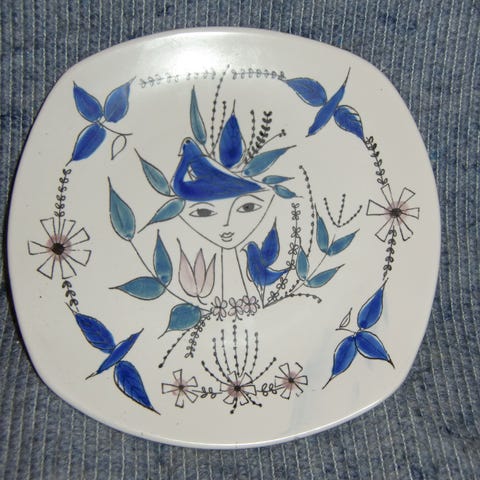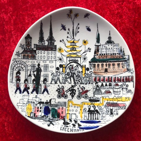 Platte, Inger Waage, Sød håndmalet platte "KØBENHAVN" med ophæng. Designet af den norske keramiker Inger Waage for Stavangerflint (1949-79).