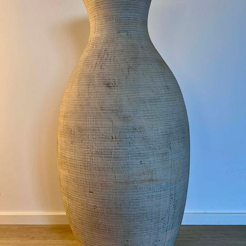 Stor råhvid krukke/vase fra Broste Copenhagen i "knit" stentøj. Købt i Illum. Har dog ikke været brugt som vase men som pynt og lidt som papirkurv i kontor. Ingen skår.