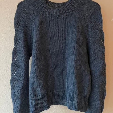 Blå trøje med stolpe-åbning/knapper, 100% superwash uld. Flot og meget elastisk mønster strik.
