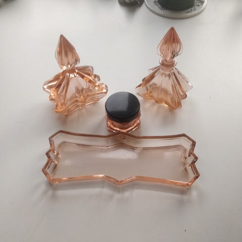 Et fad, en ringholder, en flaske og en bonbonierer, gammelrosa tror jeg farven hedder.