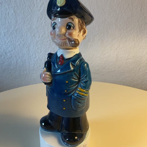 Fin lille karaffel med spille dåse. Den spiller (når den er trukket op) og karaflen løftes. Så er msn afsløret. Stopper med at spille når den bliver sat ned. I brun glasur med guld skrift “snaps” kork problem. Rummer ca 70 cl. H inkl prop ca 23 cm. Pæn. Tror den mangler en ting der skulle dreje rundt i midten, når karaflen spiller. Derfor prisen ( har selv haft en lille gris siddende. Spidsen er der endnu. Kender melodien den spiller, men ved ikke hvad den hedder. Har været brugt i hjemme baren. Ingen afslag, revner eller lign. Alm brugsspor. Alder, oprindelse ukendt. Sender gerne til pakkeshop kr 53.- - se også mine andre annoncer.